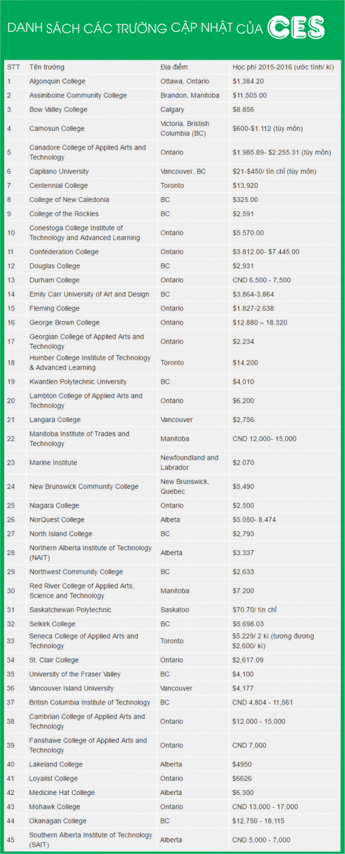 Canada luôn là mảnh đất du học lý tưởng của đông đảo các sinh viên quốc tế nói chung và sinh viên Việt Nam nói riêng. Hiện nay, thông qua chương trình CES - chương trình Visa Ưu tiên và các trường thành viên gia nhập ngày càng nhiều, cơ hội được đặt chân lên đất nước này để du học càng mở rộng với sinh viên Việt Nam hơn bao giờ hết. APACO cập nhật tới bạn danh sách 45 trường tham gia chương trình CES.