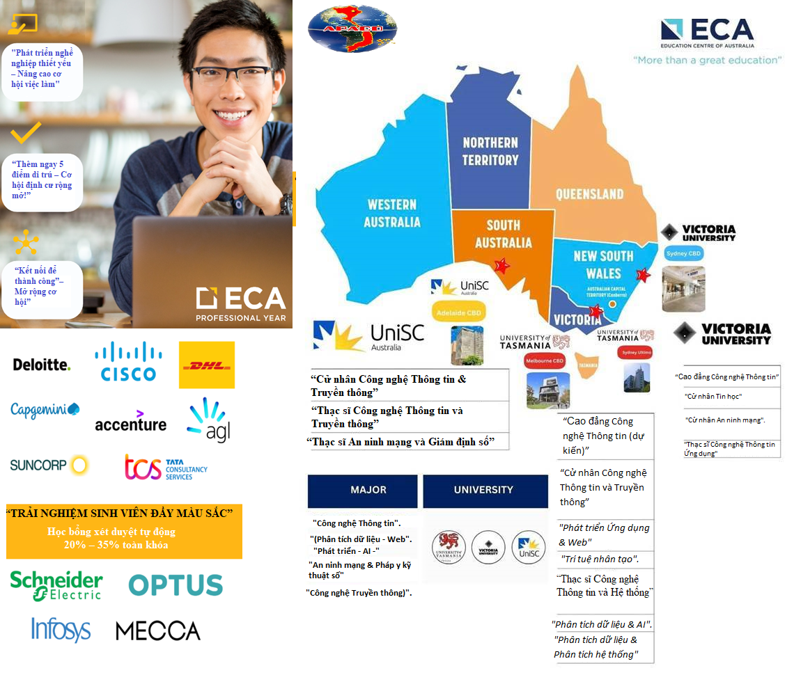 Trong thời đại chuyển đổi số diễn ra mạnh mẽ, Công Nghệ Thông Tin (IT) đã trở thành “hạ tầng” cốt lõi của mọi ngành nghề – từ tài chính, y tế, logistics cho đến giáo dục. Sinh viên ngành IT không chỉ cần kiến thức học thuật, mà quan trọng hơn là kinh nghiệm thực tiễn và cơ hội kết nối doanh nghiệp ngay khi còn trên giảng đường. Với sự hợp tác cùng Victoria University, University of Tasmania và University of the Sunshine Coast, Education Centre of Australia (ECA) tự tin mang đến lộ trình đào tạo IT khác biệt, cân bằng giữa kiến thức học thuật chuẩn quốc tế và ứng dụng thực tế, trải rộng tại Sydney, Melbourne, Brisbane, Adelaide.