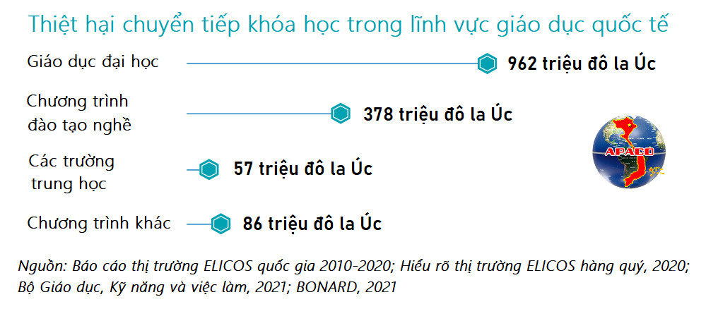 Báo cáo của BONARD đã ước tính tổng thiệt hại kinh tế là 2,7 tỷ đô la Úc cho riêng năm 2020, bao gồm 1,2 tỷ đô la Úc học phí và sinh hoạt phí của sinh viên đăng kí khóa ELICOS, và 1,5 tỷ đô la Úc cho những chương trình chuyển tiếp khi hoàn thành khóa tiếng anh. “Theo dữ liệu từ Bộ Giáo dục, Kỹ năng và Việc làm (DESE), 47% sinh viên ELICOS sẽ chuyển sang một lĩnh vực giáo dục quốc tế khác ở Úc khi đăng ký diện thị thực sinh viên (student visa)” được chỉ ra trong nghiên cứu.