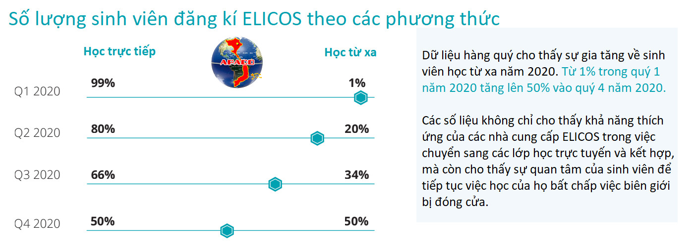 Báo cáo cũng giải thích rằng thiệt hại kinh tế sẽ còn lớn hơn nếu các nhà cung cấp khóa ELICOS không nhanh chóng cung cấp các chương trình trực tuyến cho sinh viên nước ngoài. Trước đại dịch COVID, có rất ít sinh viên theo học khóa ELICOS trực tuyến. Tuy nhiên, như biểu đồ sau minh họa, hơn một nửa số học sinh ELICOS đăng ký theo học các khóa học trực tuyến vào cuối năm 2020.